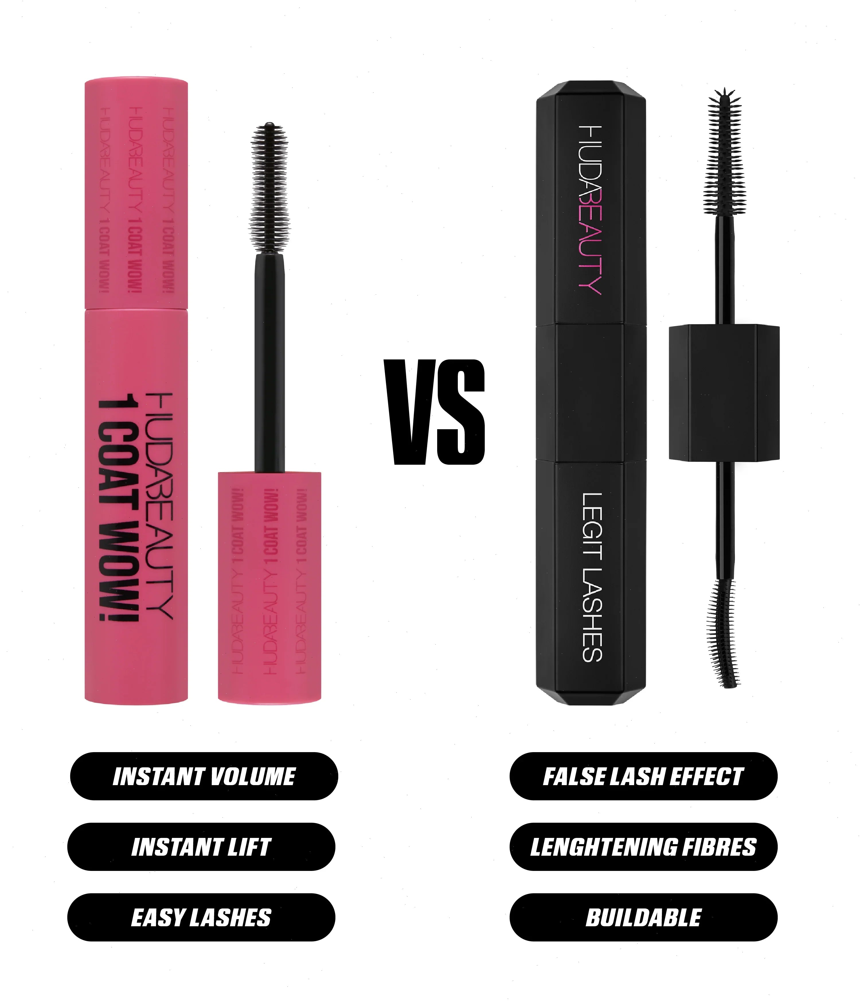 Your answer to instant, intense, and dramatic lashes in seconds! The innovative dual-sided brush and formula coat and define every lash for mega curl, immediate length, and extra volume! HUDABEAUTY 1 COAT WOW! makes quick application so easy. Prepare for that ‘WOW’ effect!