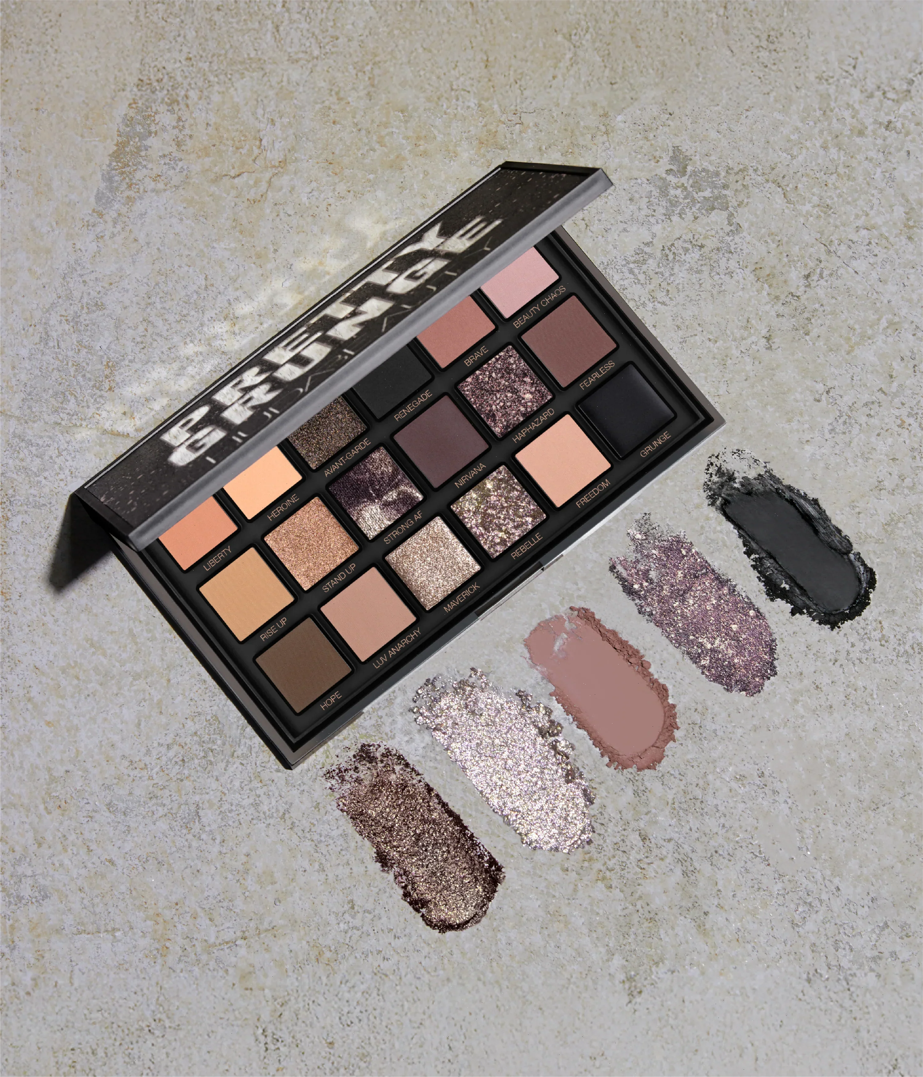 Part of our Pretty Grunge Collection, this eyeshadow palette takes our iconic glam look to a new realm of playful grungeyness. Combining grunge and glam into one look merges two maximalist beauty trends – instantly iconic